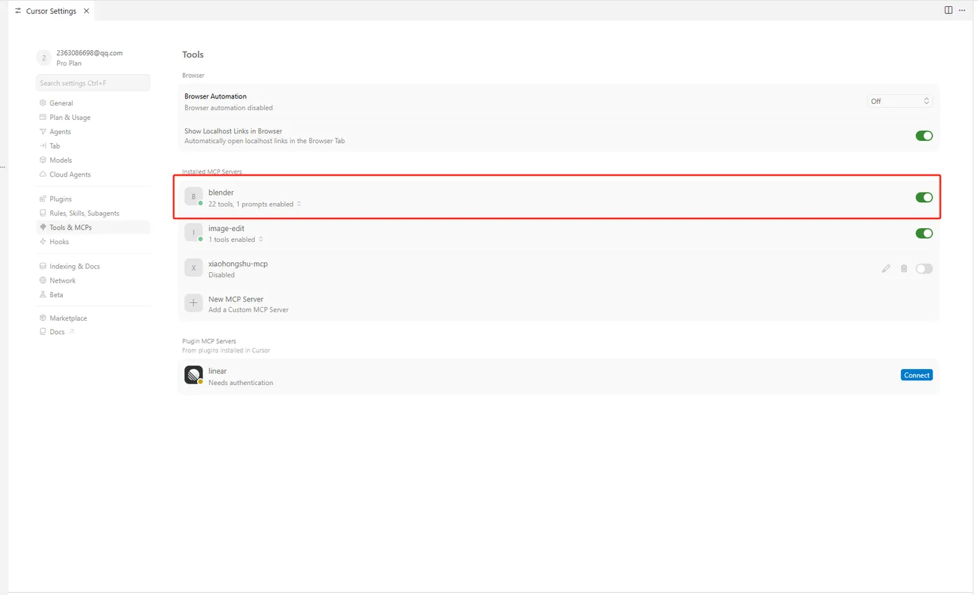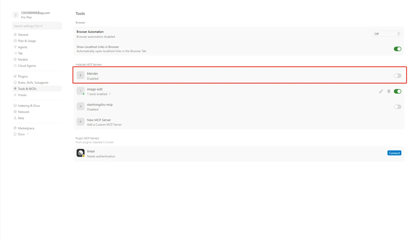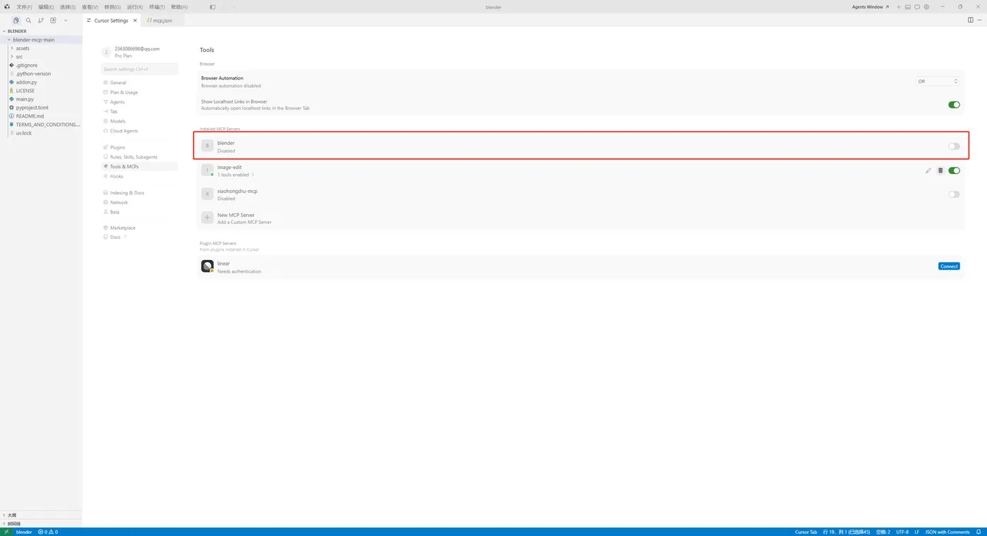 - 保存配置后,Cursor会自动加载该MCP服务,若配置正确,服务列表中会出现「blender」服,即说明配置成功。