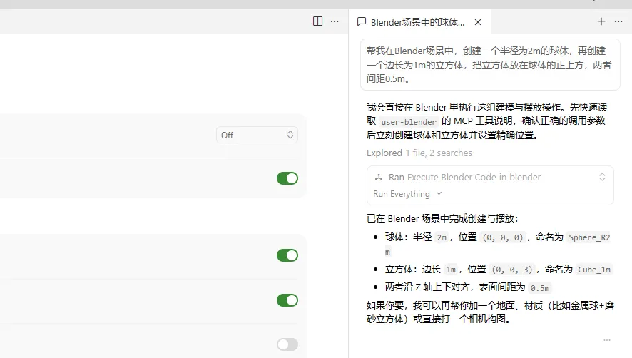 我们用一条最简单的指令,验证AI是否能正常操控Blender: 在Cursor的对话输入框中,输入以下指令,发送给AI: