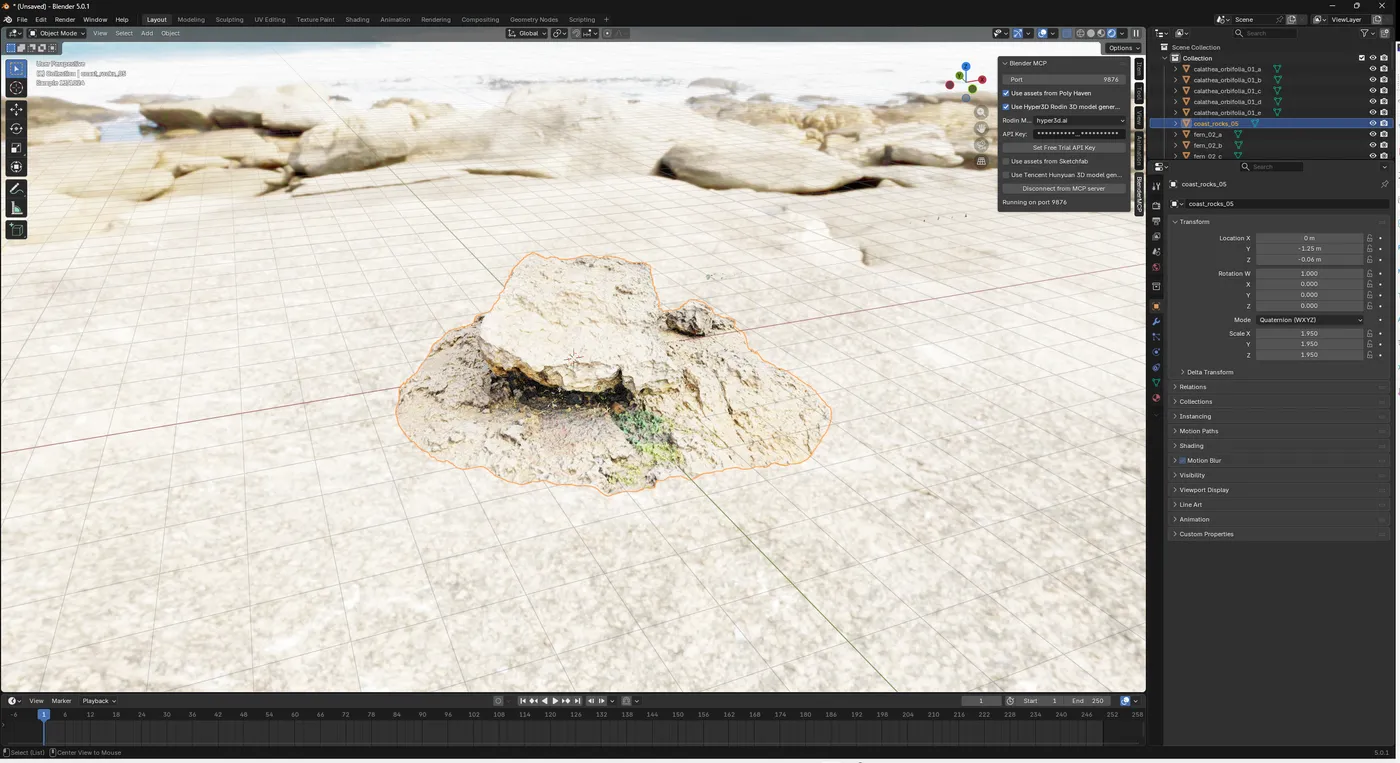 帮我从Poly Haven下载一个适合海边的HDRI环境贴图,应用到场景中,再下载一个岩石模型和3个不同的海草模型,摆放在场景的前景位置,做出海边礁石的效果。