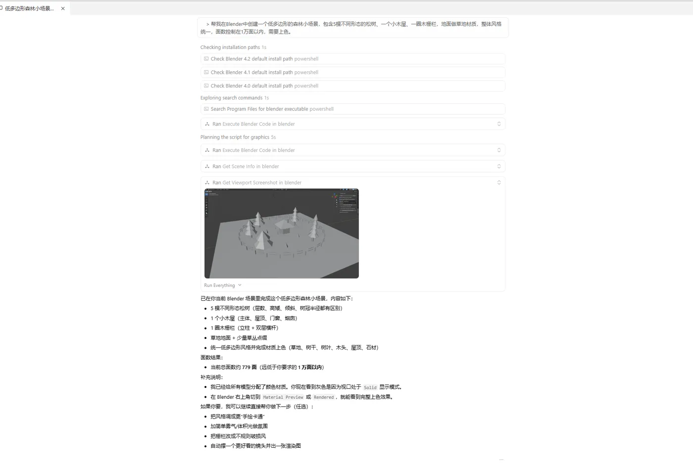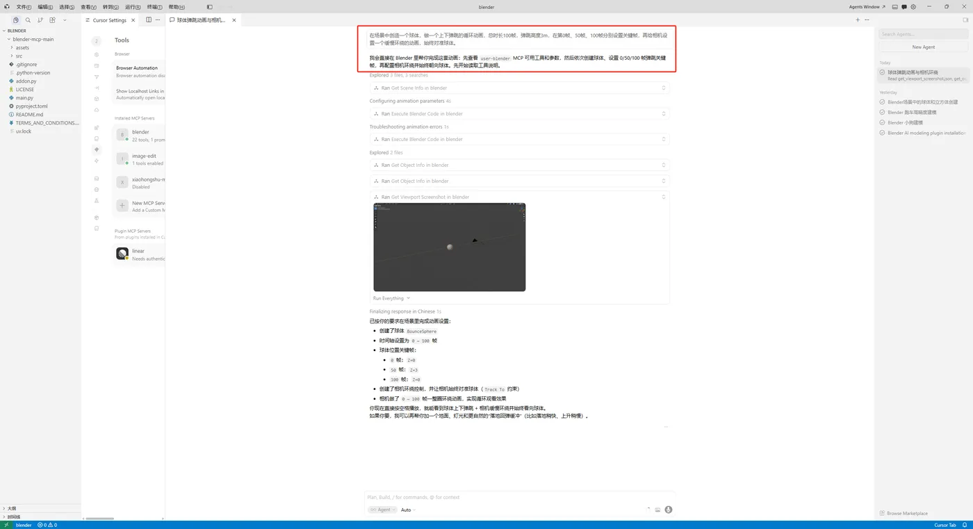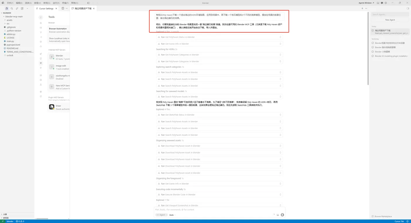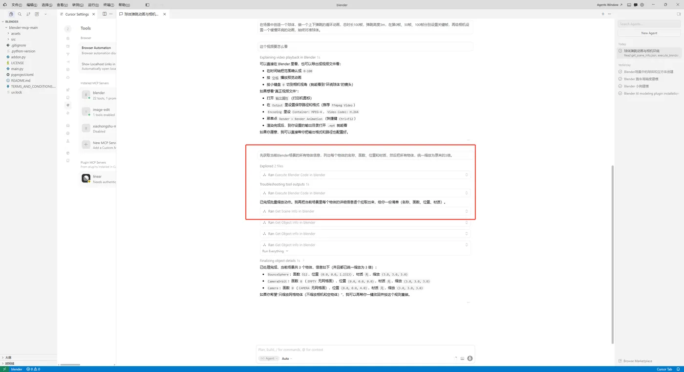 全局配置完成后,你在Cursor中打开的所有项目,都可以直接使用Blender MCP服务,无需重复配置。