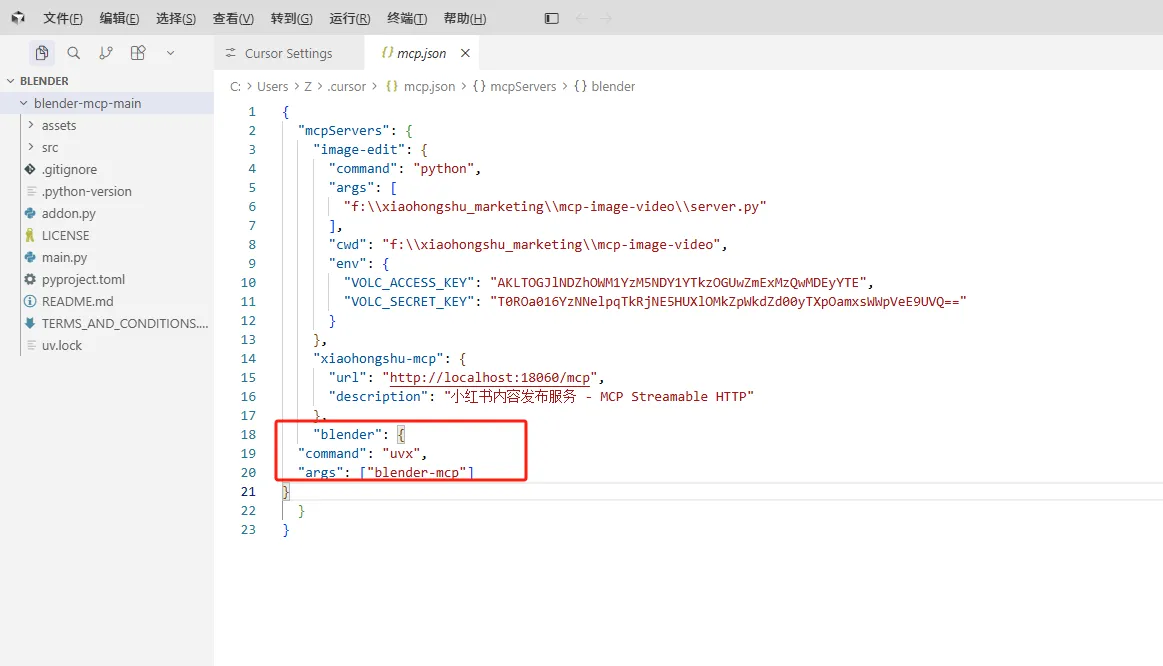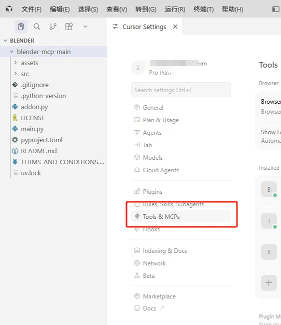这一步是建立和Blender通信的核心,我们提供全局MCP配置(推荐) 和项目专属配置两种方案,任选其一即可。这边我们以Cursor为例