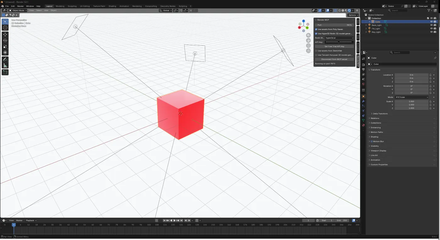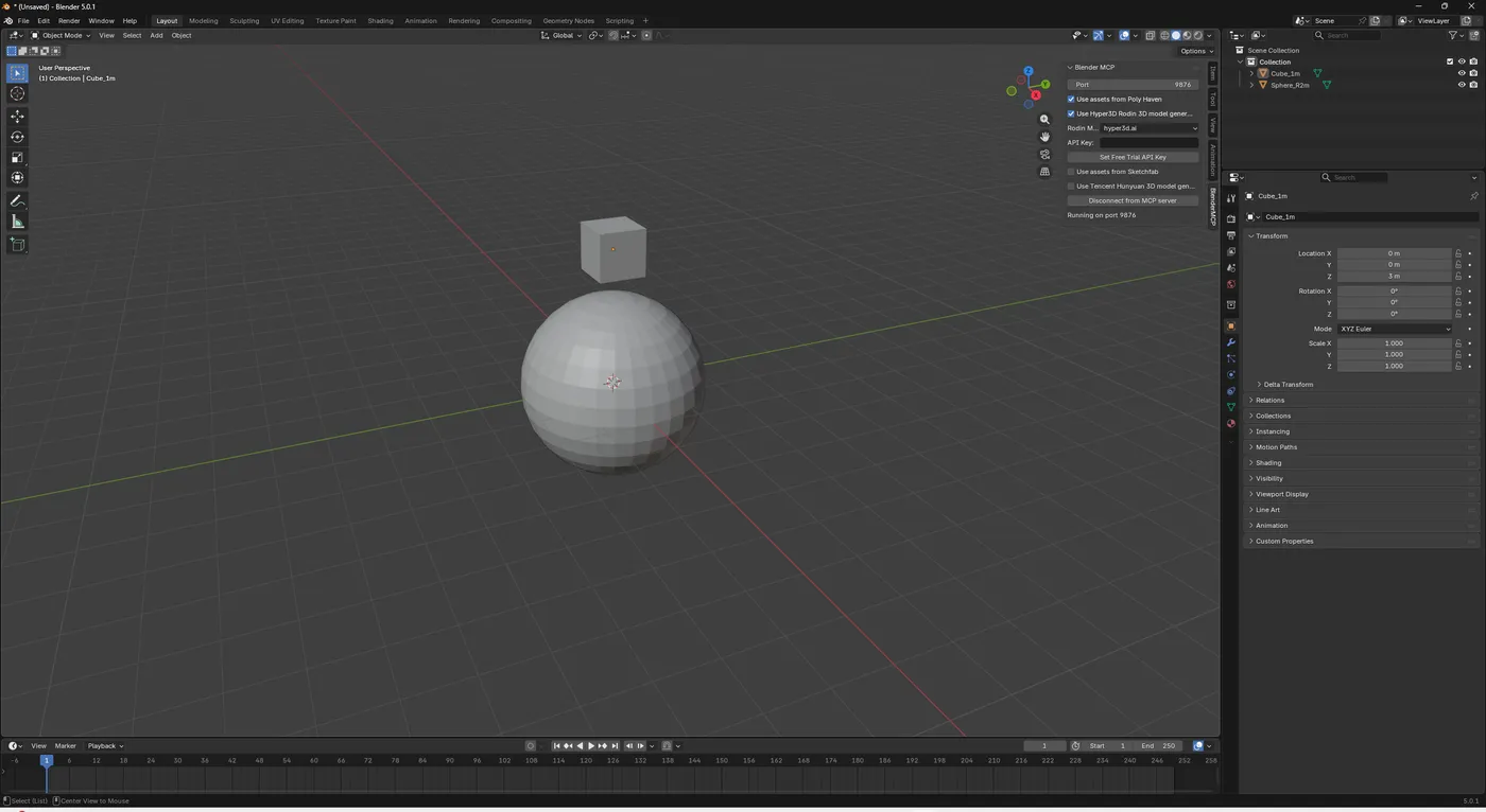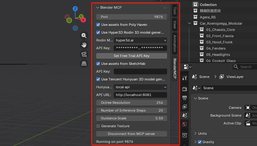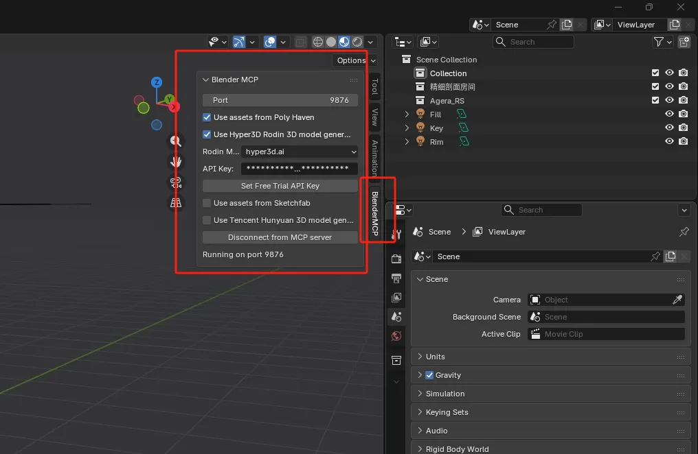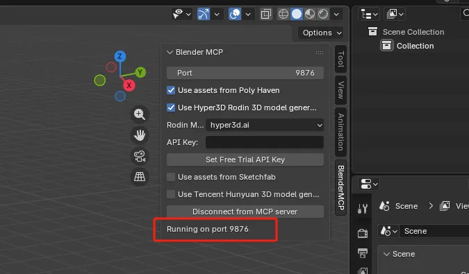 - 按钮下方出现「Running on port 9876」的提示,即说明Blender端的socket服务已成功启动,正在等待Cursor的连接。