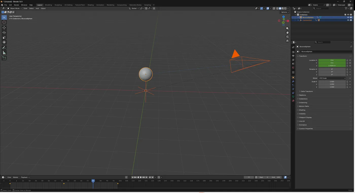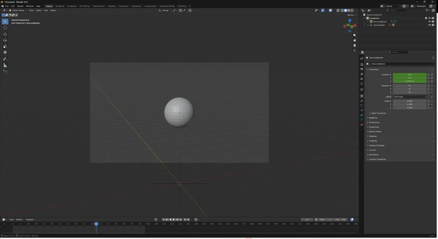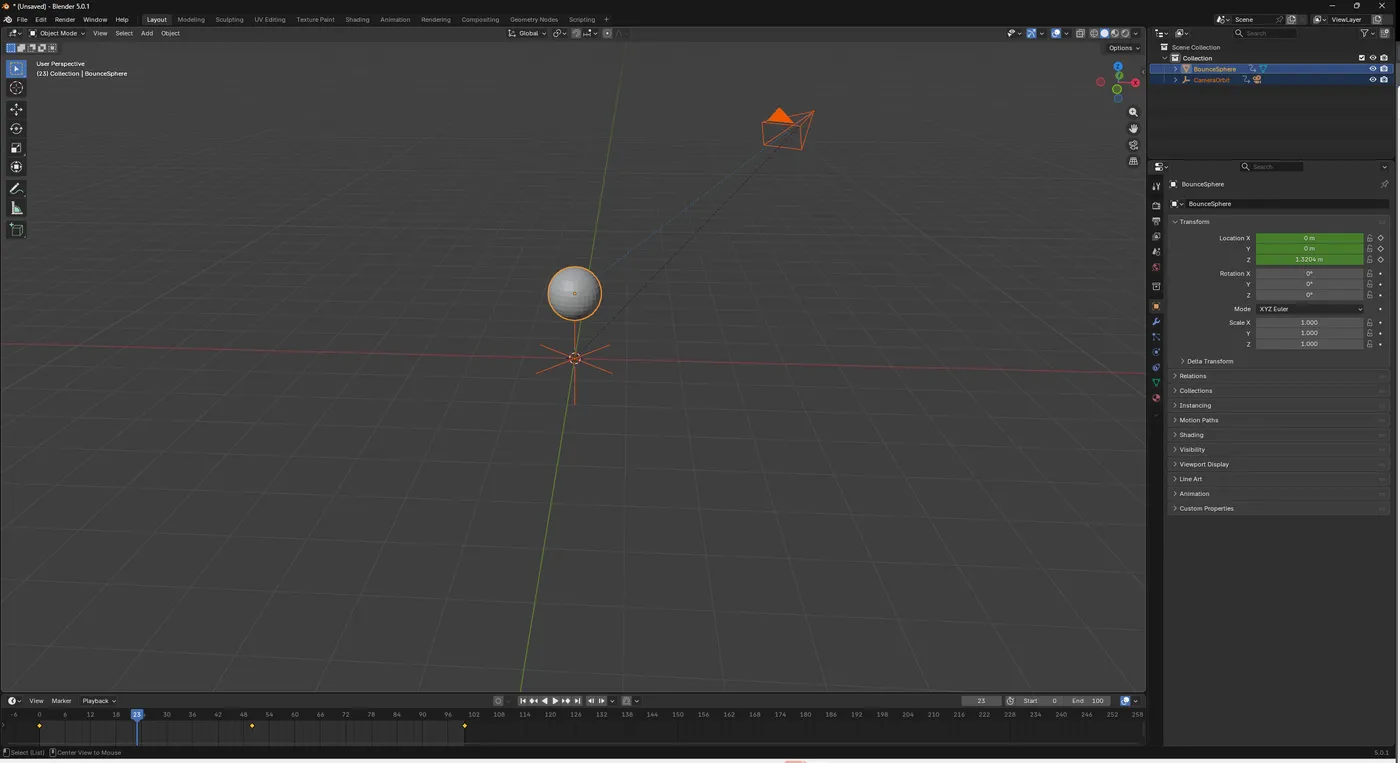 在场景中创造一个球体,做一个上下弹跳的循环动画,总时长100帧,弹跳高度3m,在第0帧、50帧、100帧分别设置关键帧,再给相机设置一个缓慢环绕的动画,始终对准球体。