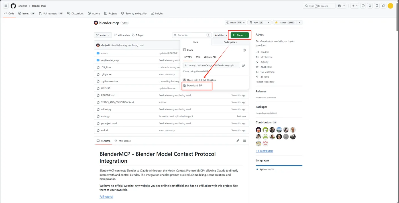 - 打开blender-mcp的GitHub仓库:https://github.com/ahujasid/blender-mcp 按照以上步骤下载压缩包之后并解压,确保解压之后文件夹如下所示