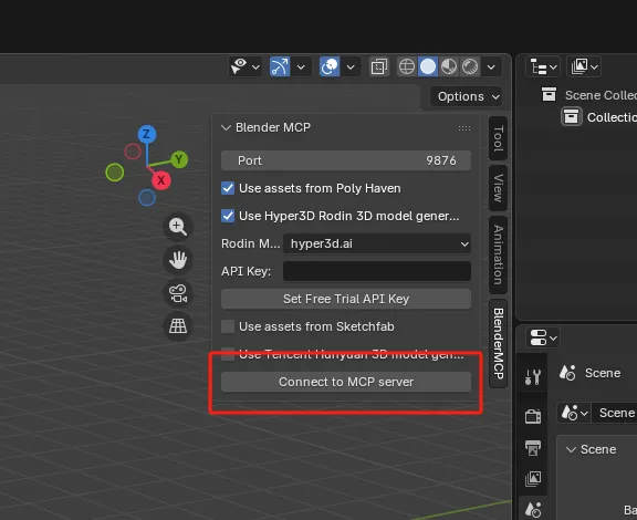 N键,调出3D视图的右侧侧边栏。 - 在侧边栏的标签中,找到「BlenderMCP」标签,点击进入,若能看到插件的控制面板(包含端口设置、连接按钮、资产开关等),即说明插件安装成功。
