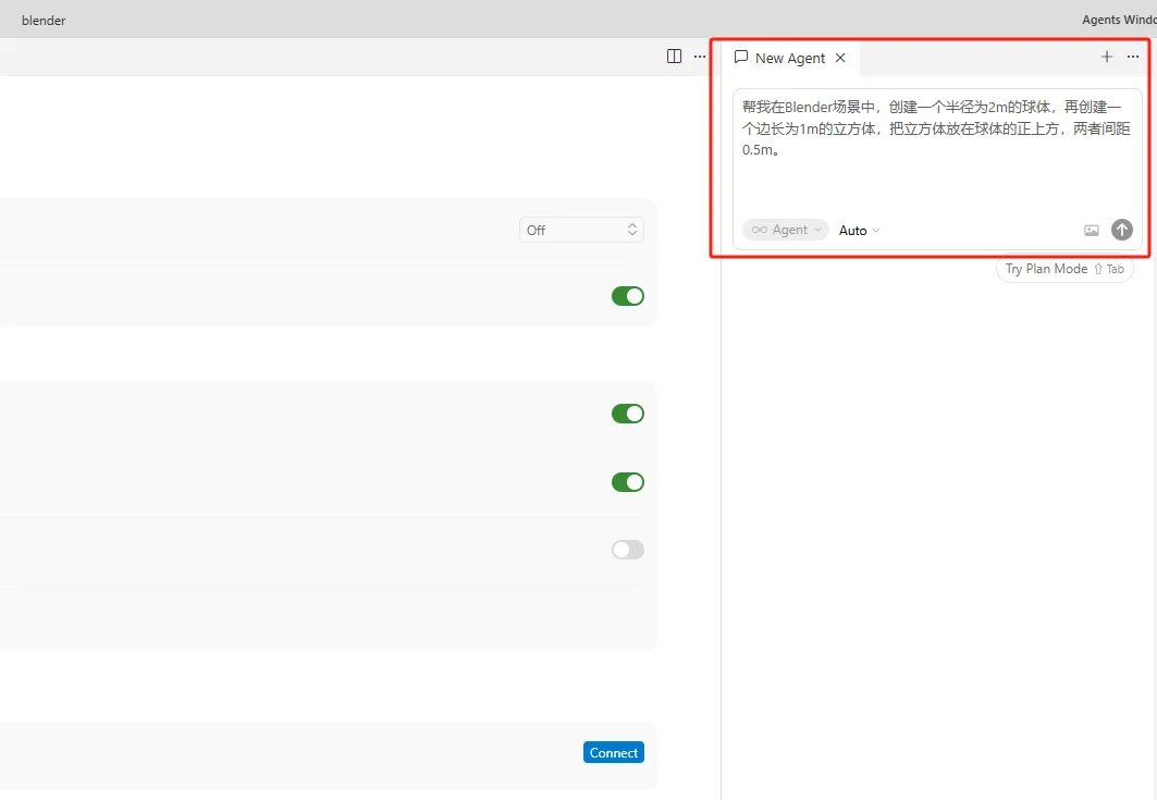完成以上所有配置后,我们来完成最终的连接,验证AI是否能正常操控Blender。