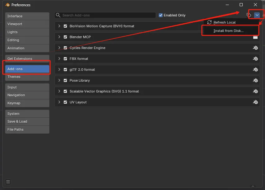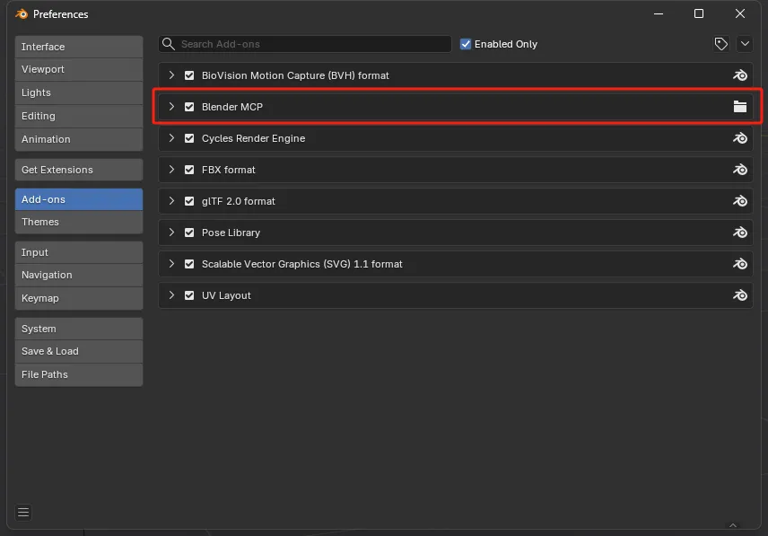 - 安装完成后,在插件列表中,搜索「Blender MCP」,会找到名为「Interface: Blender MCP」的插件,勾选插件前方的复选框,启用插件。