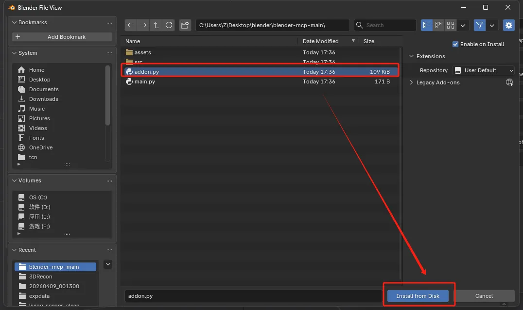 注意:若你之前安装过旧版blender-mcp,需先在Blender中禁用并卸载旧版插件,再安装新版,避免冲突。