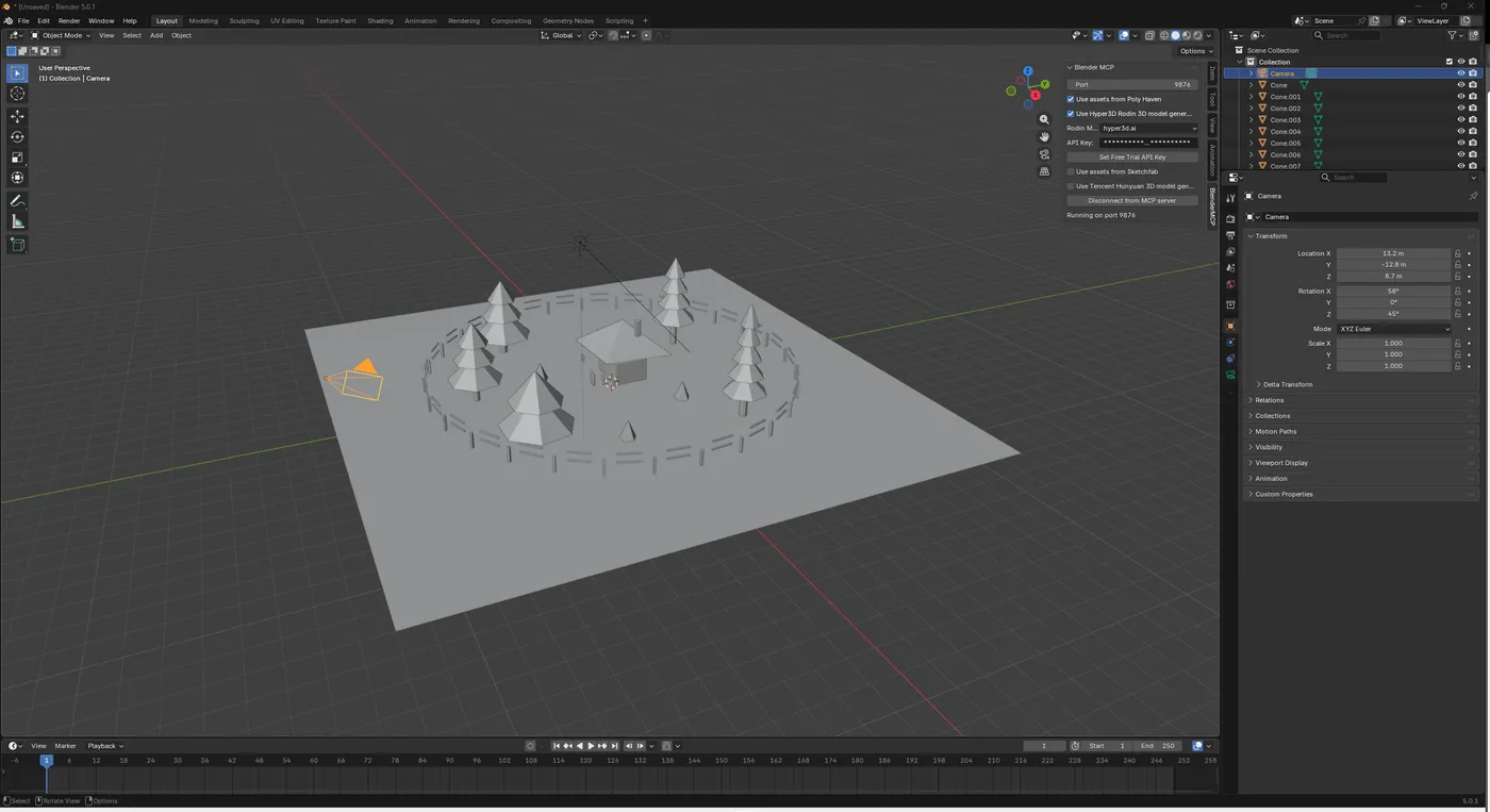 帮我在Blender中创建一个低多边形的森林小场景,包含5棵不同形态的松树、一个小木屋、一圈木栅栏,地面做草地材质,整体风格统一,面数控制在1万面以内。