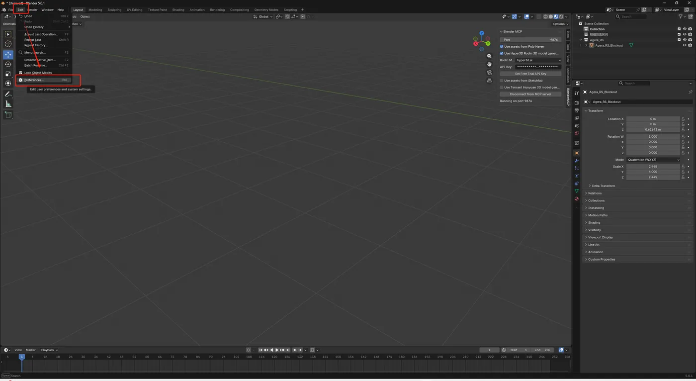 - AI模型生成集成:插件已支持Hyper3D、混元3D等AI生成模型,可在配置中添加自己的API密钥,直接用文生3D模型,导入到Blender场景中。