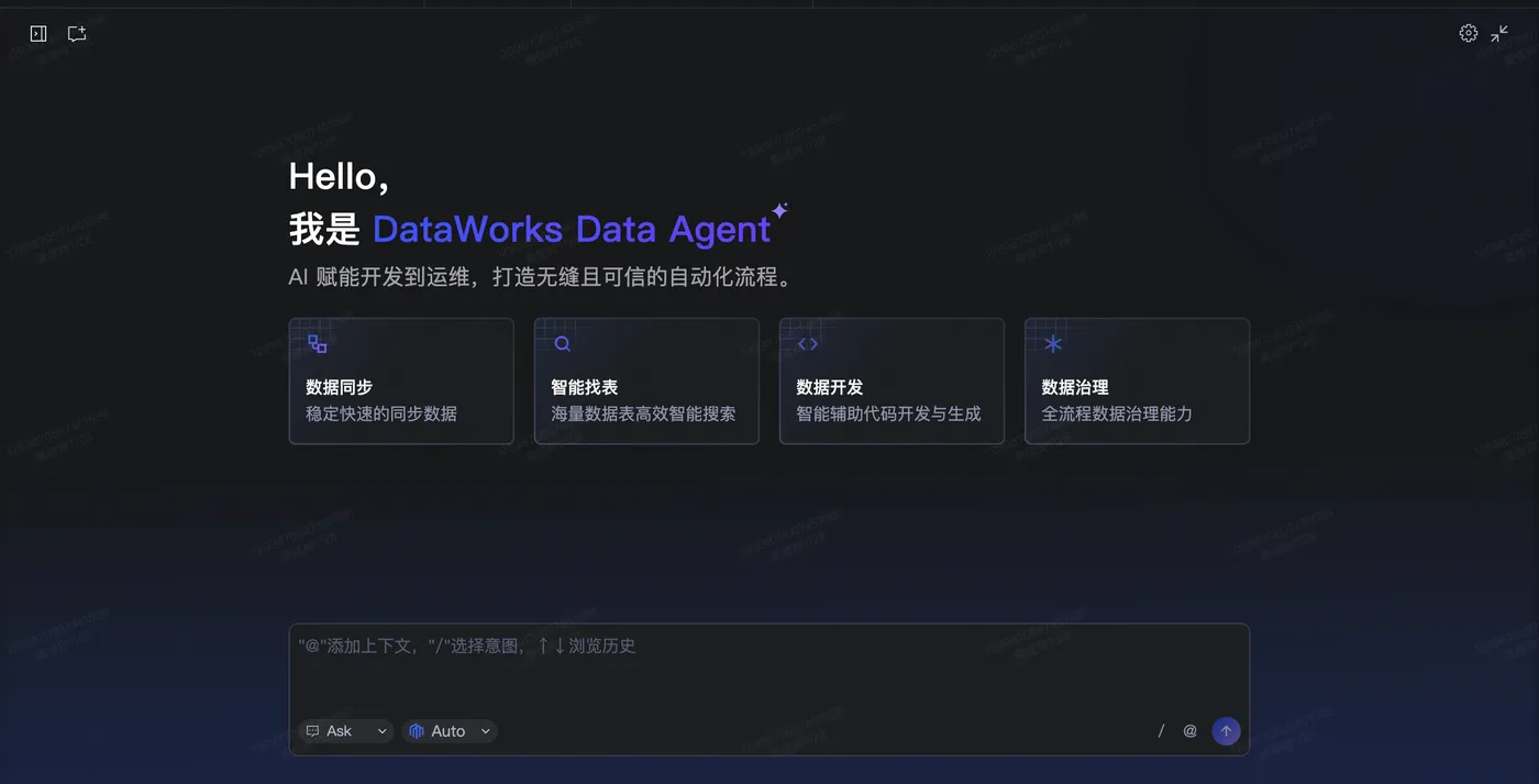 DataWorks Data Agent 覆盖数据集成、开发、运维、治理、分析全链路,能够用自然语言完成复杂的数据开发任务,为用户提供高效可信的智能化数据开发体验。