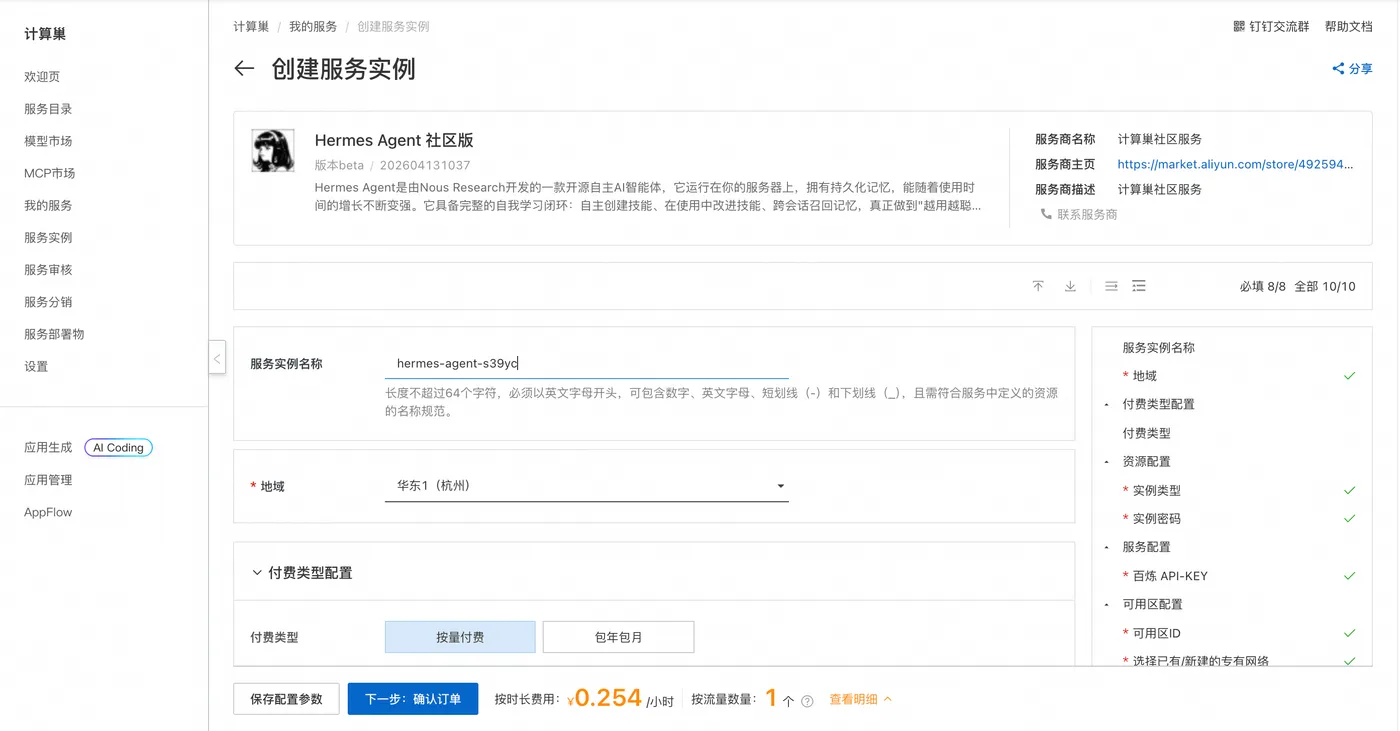 1、访问计算巢 HermesAgent 社区版【部署链接】,按页面提示填写部署参数: