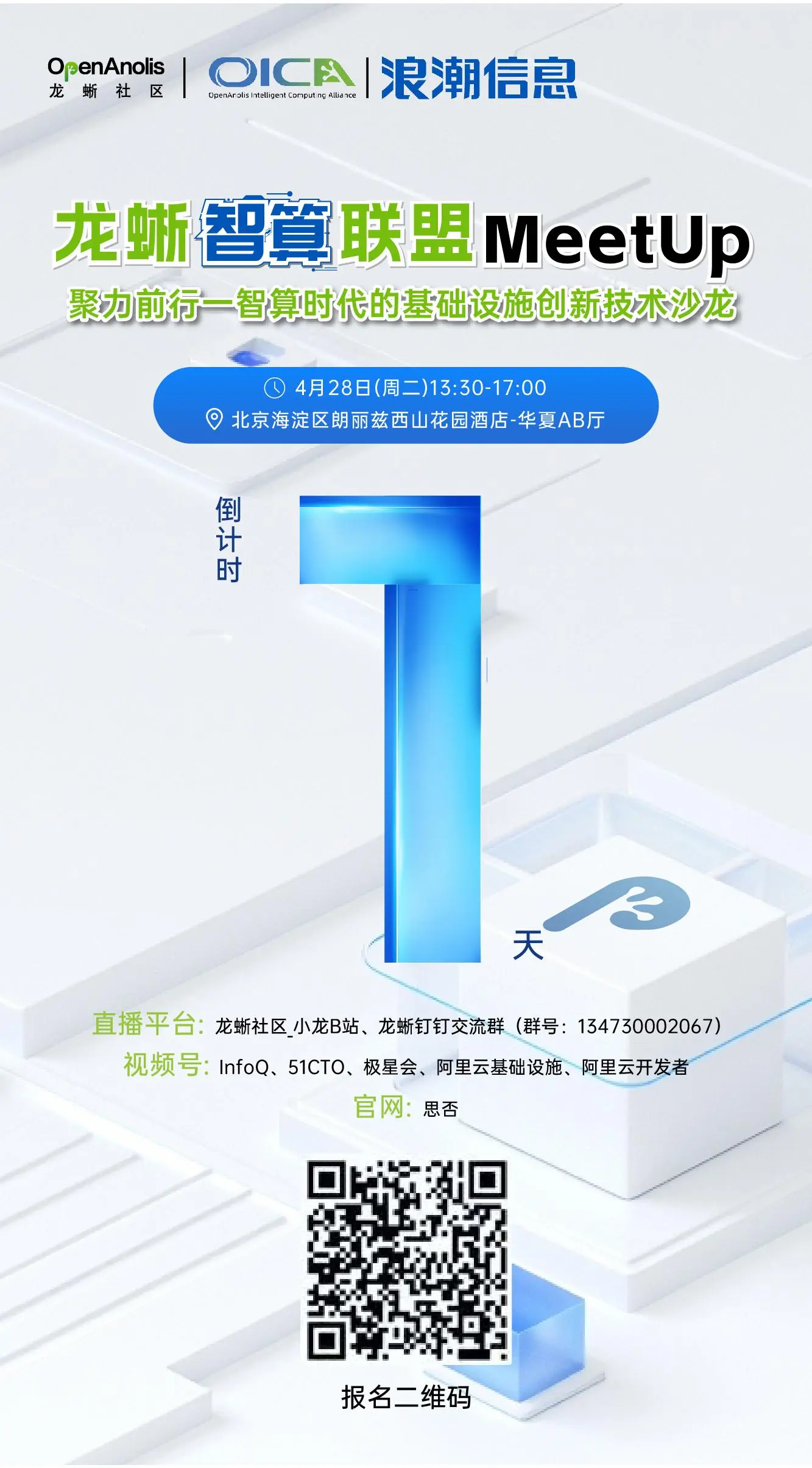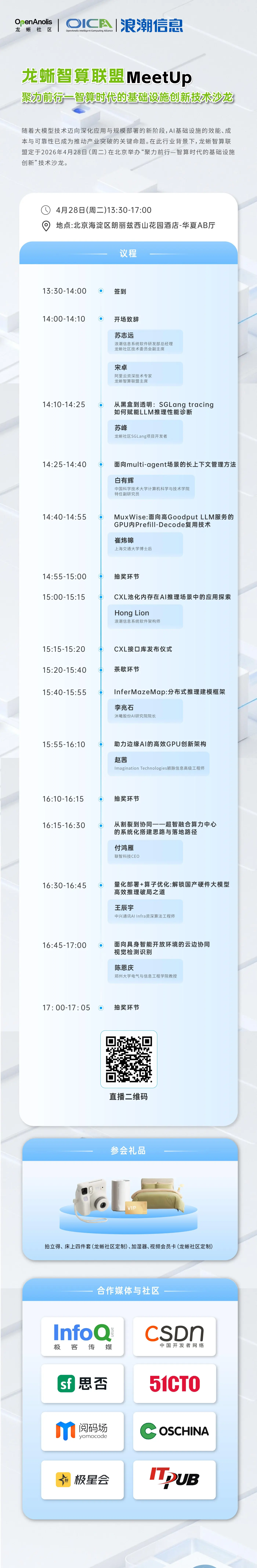 4 月 28 日(本周二),由龙蜥智算联盟主办、浪潮信息承办的以「聚力前行—智算时代的基础设施创新」为主题的 MeetUp 将在北京海淀区朗丽兹西山花园酒店-华夏 AB 厅举办,活动聚焦 AI Infra 产学研用全链路最新技术趋势与产业动态,从技术原理到落地实践,全方位解析 AI 基础设施创新路径。本次 MeetUp 不仅有干货满满的技术分享,更有重磅礼品拍立得、加湿器等大奖等你来拿。入门即有礼哦,欢迎报名(4 月 27 日截止):https://openanolis.mikecrm.com/eoV0ryn