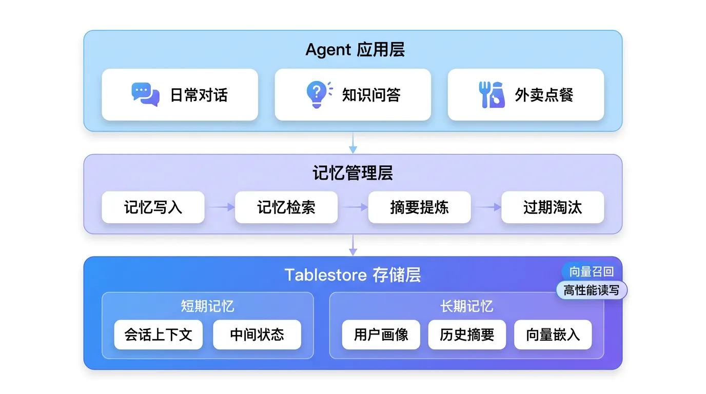 Tablestore 进一步封装了开箱即用的记忆存储解决方案,提供短期/长期记忆统一管理能力,内置了短期记忆到长期记忆的自动抽取流程,开发者无需自行编排,降低业务接入门槛和开发成本。