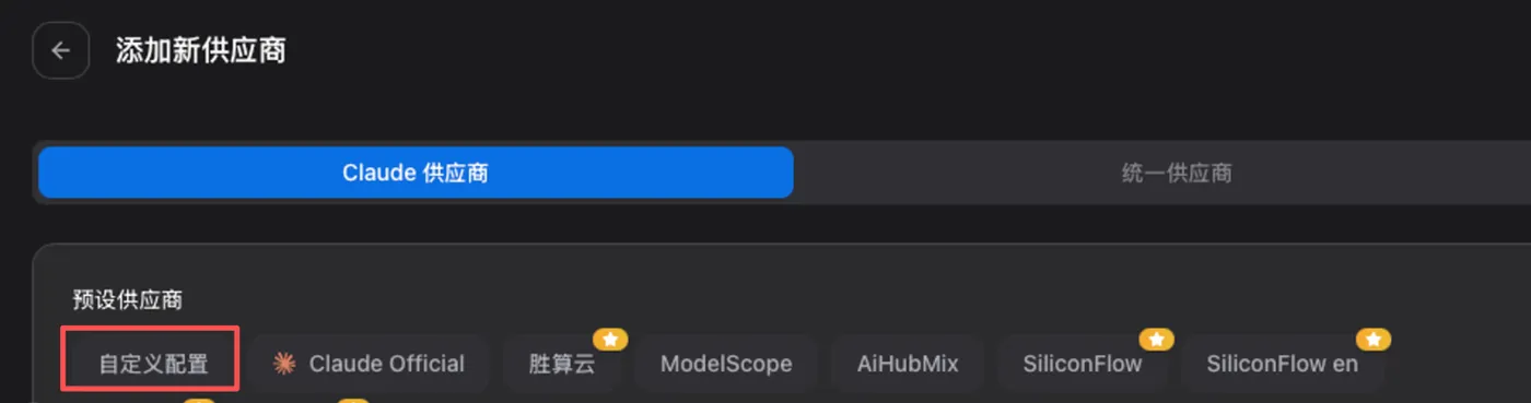 打开cc-switch,点击右上角加号,选择“自定义配置”。