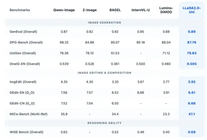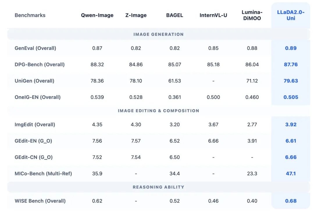 全能表现:一个模型,搞定一切。无论是图像理解、图像生成还是图像编辑,LLaDA2.0-Uni 在三大领域均已达到统一模型的领先水准。