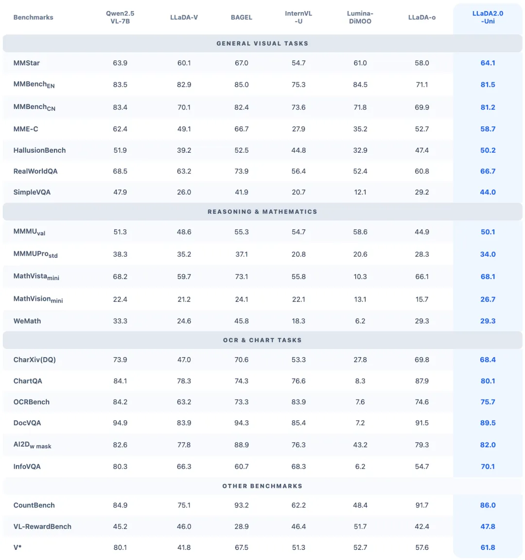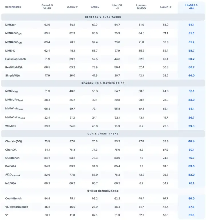 多模态理解能力 在多模态理解方面,LLaDA2.0-Uni 在 21 个权威基准上表现优异,在通用 VQA、逻辑推理与 OCR/文档理解三大核心场景中均表现出顶尖水准,性能足以媲美专有视觉语言模型(VLMs)。