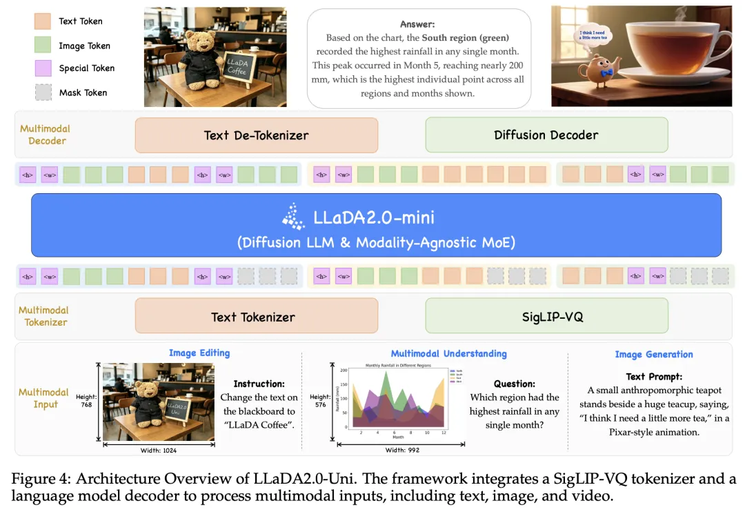 依托 LLaDA 2.0 的 MoE 基座,将多模态理解与生成任务深度整合为统一的分块掩码预测(block-wise mask prediction)范式。通过纯粹的掩码预测目标进行全离散扩散建模,彻底打破了传统多模态模型对自回归(AR)范式的依赖,并原生具备并行解码的极速推理优势。