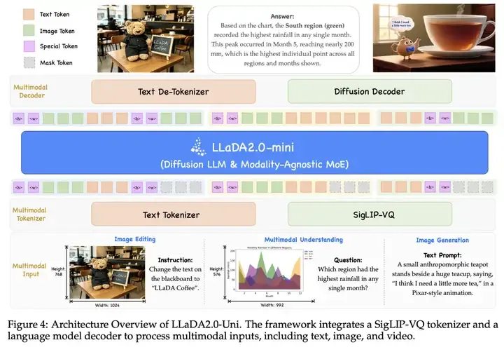 LLaDA2.0-Uni 采用 LLaDA-2.0-mini 作为 dLLM 骨干网络,这是一个总参数量为 16B 的 MoE 模型。模型架构具体设计: