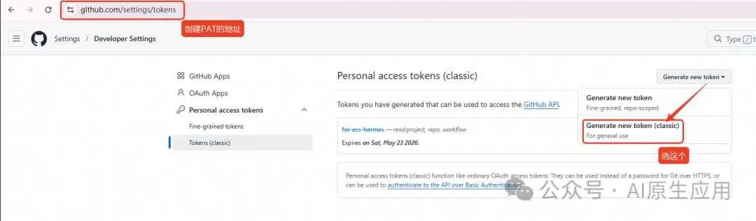 要求 hermes 部署到 GitHub Pages 后有些麻烦的是它会要求我们去做两件事:一是创建 PAT(Personal Access Token),二是提供 4 个信息项。这看着有点复杂,好在 hermes 提供了创建 PAT 的流程和对应的访问地址。(这需要有个 GitHub 账号)