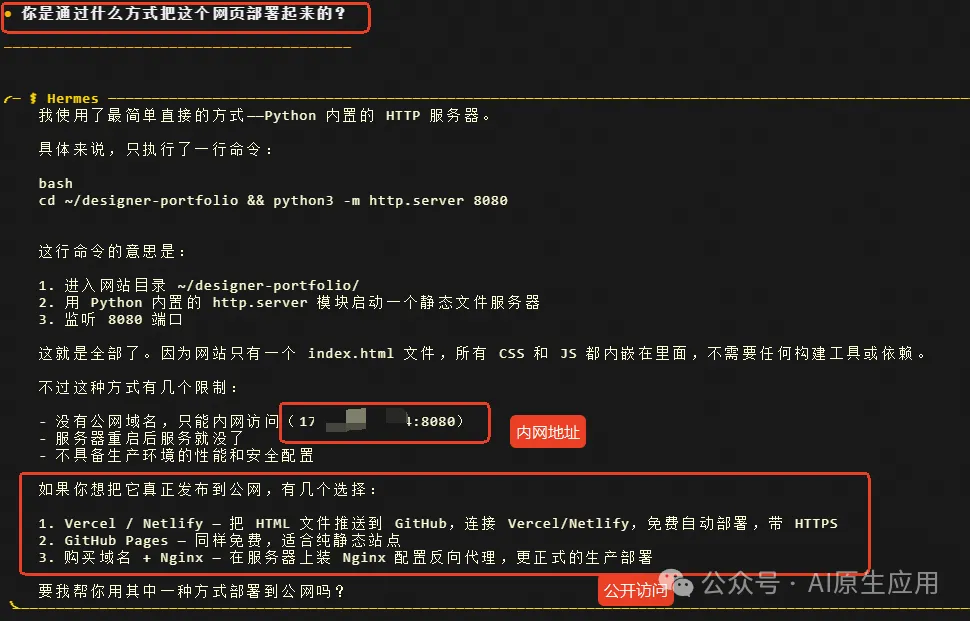 个性化网站非常实用,无论用于展示作品、作为在线简历还是记录博客,都能让人眼前一亮。然而对于不懂代码的普通人来说,搭建网站门槛不低——买服务器、配环境、学代码、配域名,光听这些词就让人打退堂鼓了。市面上的建站工具要么收费贵,要么模板僵化,难以满足个性化需求。那有没有一种方法,无需写一行代码,就能低成本、快速上线一个漂亮的个人网站?下面我借助 AI 助手 hermes-agent(简称"hermes"),仅用2个步骤 4 条简单指令,完成建站、部署与公开访问全流程。在开始介绍操作前,先看一眼生成的网站效果。