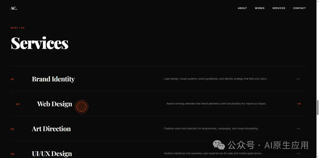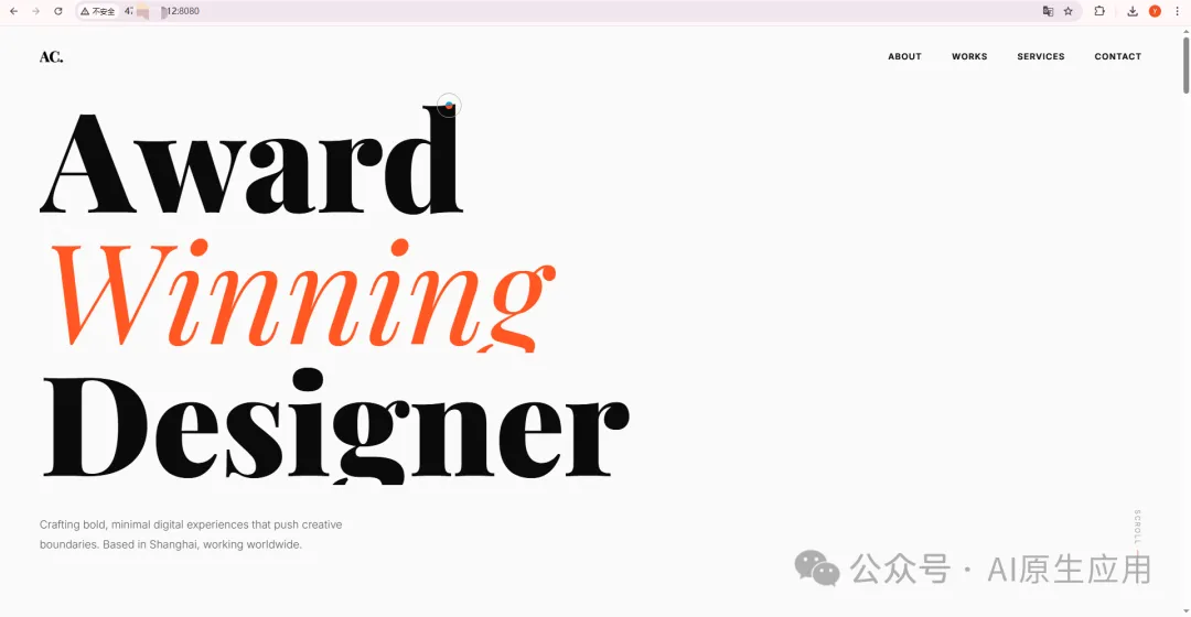 “按以下要求写个网页,然后把它部署起来,要求如下:为一位获得 Awwwards 提名的设计师设计个人网站,网站特色包括大面积留白、超大衬线字体标题、可跟随鼠标移动的自定义光标、鼠标悬停在作品集图片上时可切换视角、页面滚动时文字带有视差效果,以及仅以黑白为主色调,并以亮橙色点缀的配色方案。”