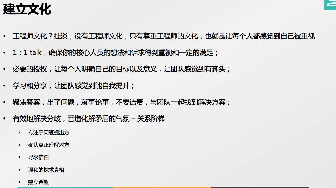建立宽松的团队文化,尊重、放权、解决矛盾、有效沟通、合理衡量。