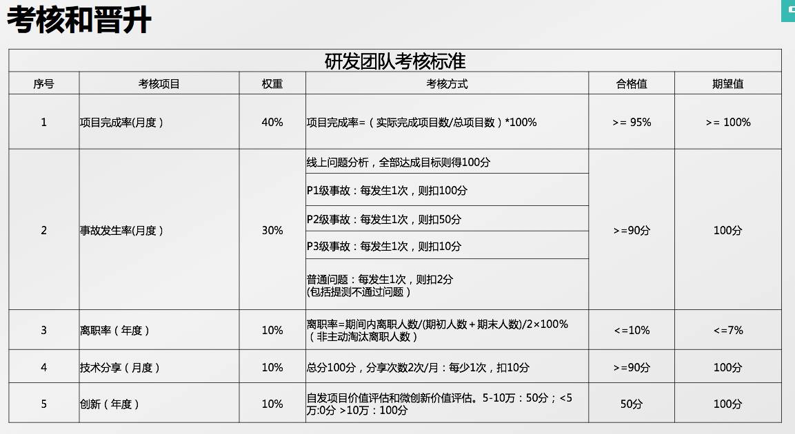 赏罚分明,避免大锅饭,非常有必要。绩效考核有多种方法,可以是KPI也可以是OKR,但是不要太过追求形式,主要的目的还是帮助团队成员成长。下图为我们简化过的团队KPI的考核方式,明年随着团队业务逐渐稳定,我们会逐步用OKR的考核方式替换KPI。