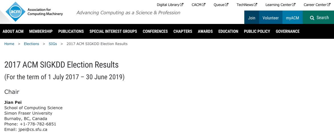 根据新智元获得的最新消息,ACM SIGKDD日前公布了新一任主席的名单,加拿大西蒙弗雷泽大学教授裴健当选,任期为 2017.07.01——2019.06.30。