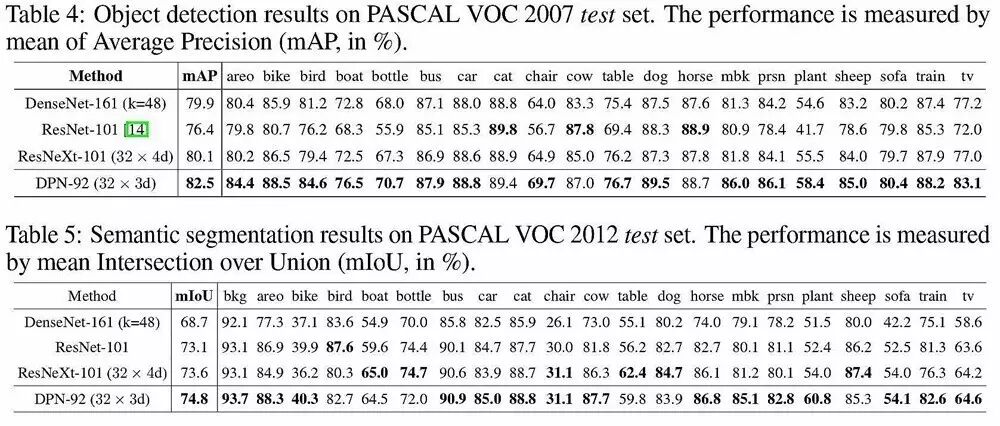 DPN 在 PASCAL VOC 上的“物体检测”和“物体分割”对比实验结果如下表所示: