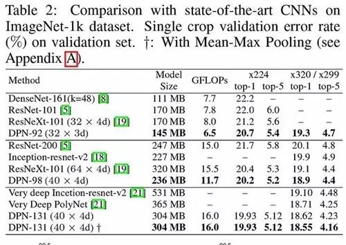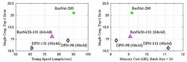 但即便如此,在实测中: DPN-98 也显著提高了训练速度,降低内存占用,并保持更高的准确率。即便是最佳单模型 DPN-131 也并没有增加很多计算量和内存开销,完全可以直接作为其他任务的基础网络来使用。相较之前的最佳单模型 Very Deep PolyNet,DPN-131 实际训练速度提升约 300%。