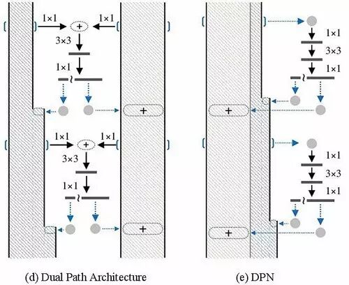 那么,一个很自然的想法就是结合这两类网络拓补结构,实现优缺点互补。于是,文章提出了一类全新的双通道网络结构:Dual Path Network(DPNs)。