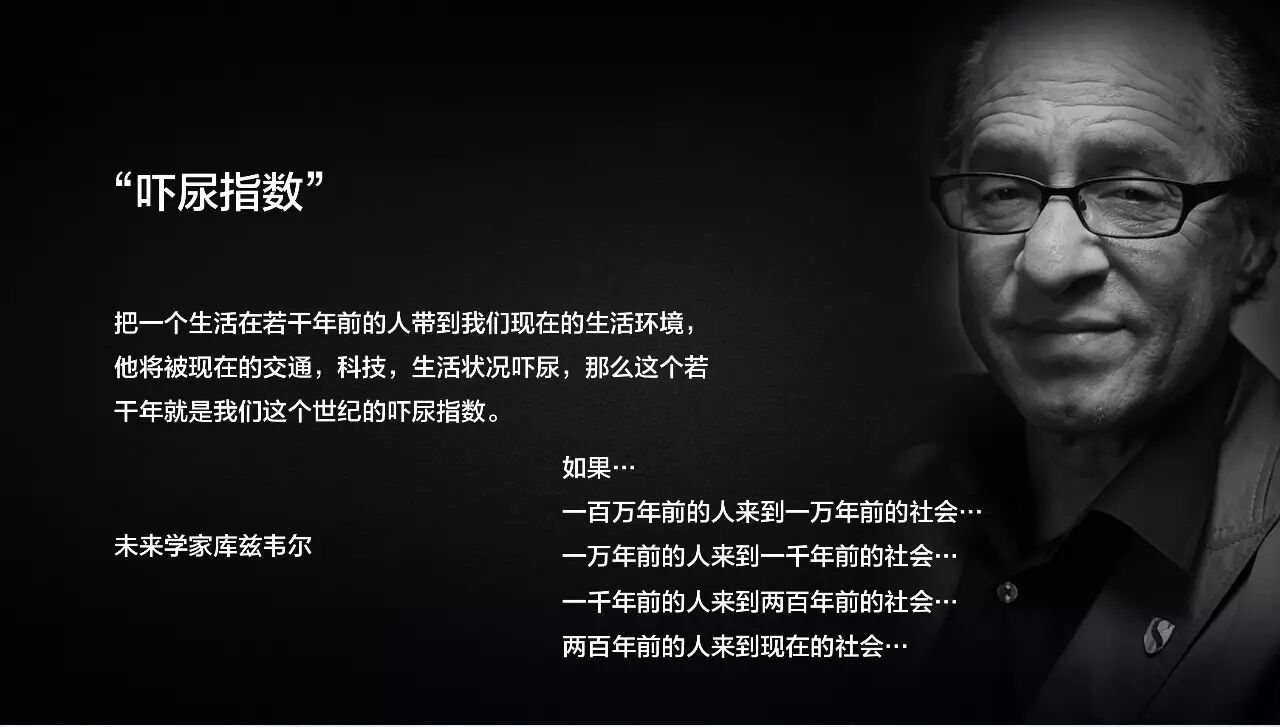 这代表了一个非常有意思的“吓尿指数”,未来学家库兹韦尔强调人类历史发展的加速度。如果生活在若干年前的人被带到今天的话,将被现在所谓的科技生活、交通现状、社会本身的现状所震惊。在几千年、几百年的社会发展中,科技进步扮演着非常重要的角色。谈到今天的时代,毫无疑问是人工智能。”
