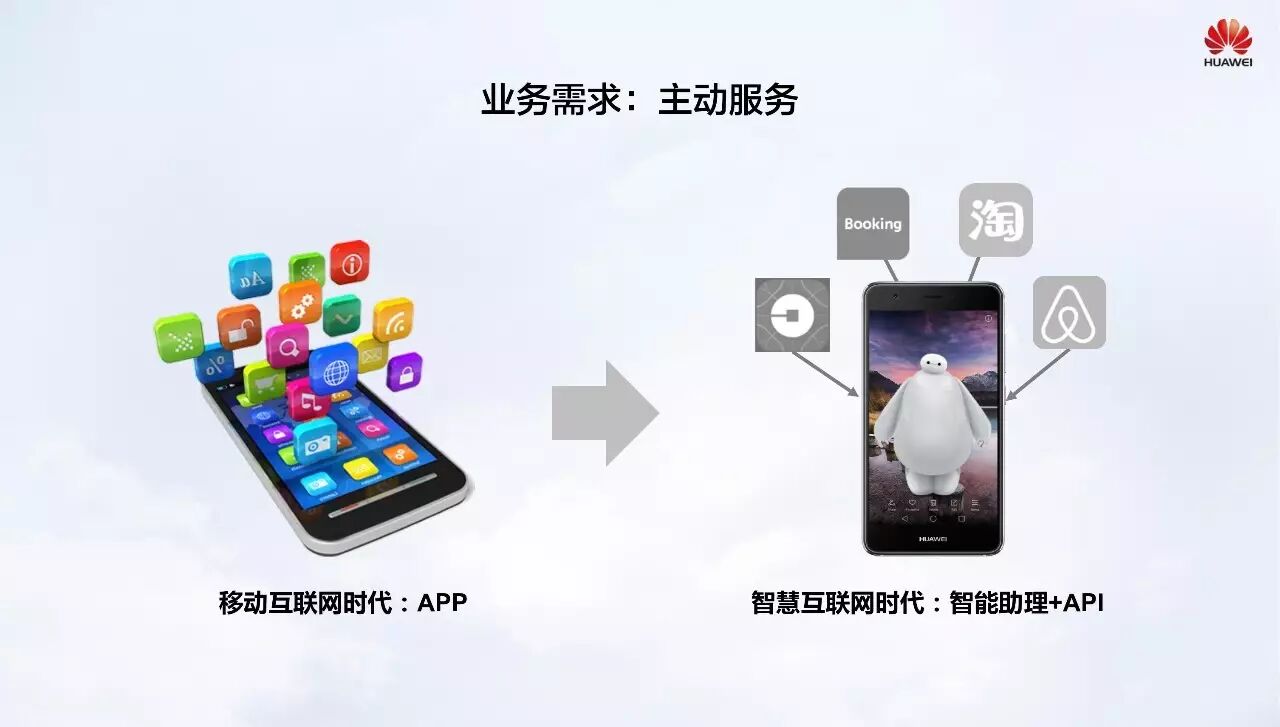 第二,变被动为主动。现在业务服务都是以 APP 的方式提供给大家,这是标准的智能手机的商业模式。但终端现状存在一些问题,比如一个用户手机平均装了一百个APP,任何一个功能,都有好几个APP能完成。打车有好几个APP,新闻阅读有好多个APP,但是每个APP,都还有一些小众化的需求是需要的。未来的智能助手,建立在用户认知基础上,替用户完成初步筛选,便利的主动推送,真正主动探知用户的需求,让用户一步完成想干的事。这是我们看到的第二个趋势,主动服务。
