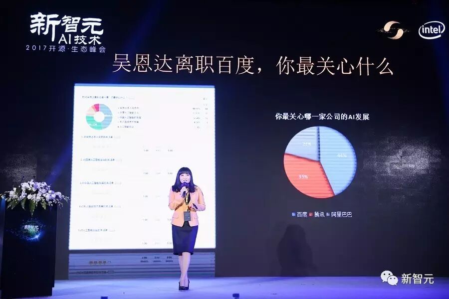 从PPT上大家可以看到,我们读者、新智元的订户对于百度人工智能的关注度是44%,对腾讯的关注度是35%,阿里巴巴是21%。以前只有百度在前面领着大家一起向世界人工智能的巅峰去冲击,但现在我们有了更多,包括腾讯、阿里在内的这样一些超级主力庄家的进场。所以,2017年中国人工智能的大棋局不仅可看,而且特别精彩。