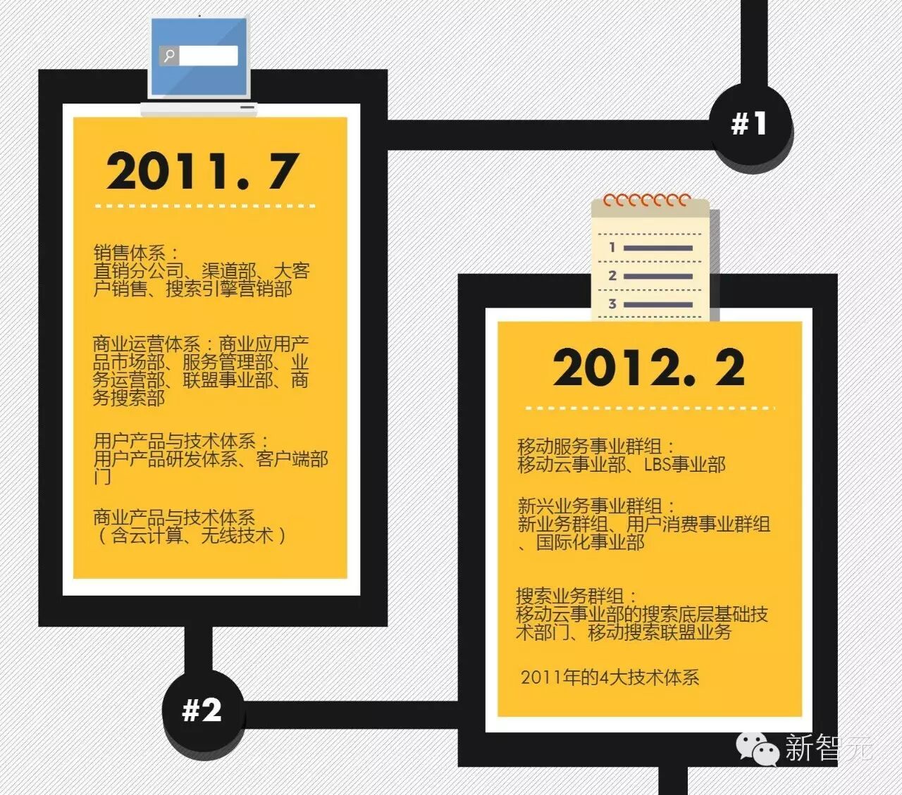 2月,公司宣布将现有业务群组和事业部整合为三大事业群组:移动服务事业群组、新兴业务事业群组、搜索业务群组,从而让业务聚焦更加适应移动互联网及服务。