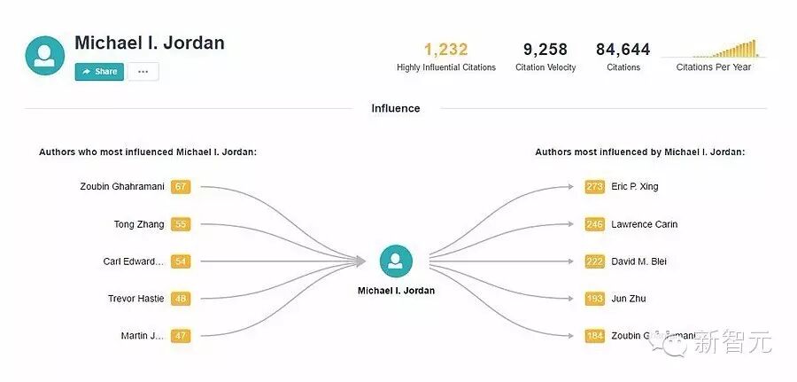 如果你要看原始引用次数最高的人,那么计算机科学领域当前顶尖科学家是加州大学伯克利分校的Scott Shenker。但使用Semantic Scholar得出的结果是,影响力最大的是Shenker的同事——同样在加州大学伯克利分校工作的Michael I. Jordan。Jordan是人工智能领域的先驱,但他的名字极少为外人所知。艾伦人工智能研究所所长、Semantic Scholar的研发负责人Oren Etzioni戏称其为“机器学习领域的迈克尔·乔丹”。