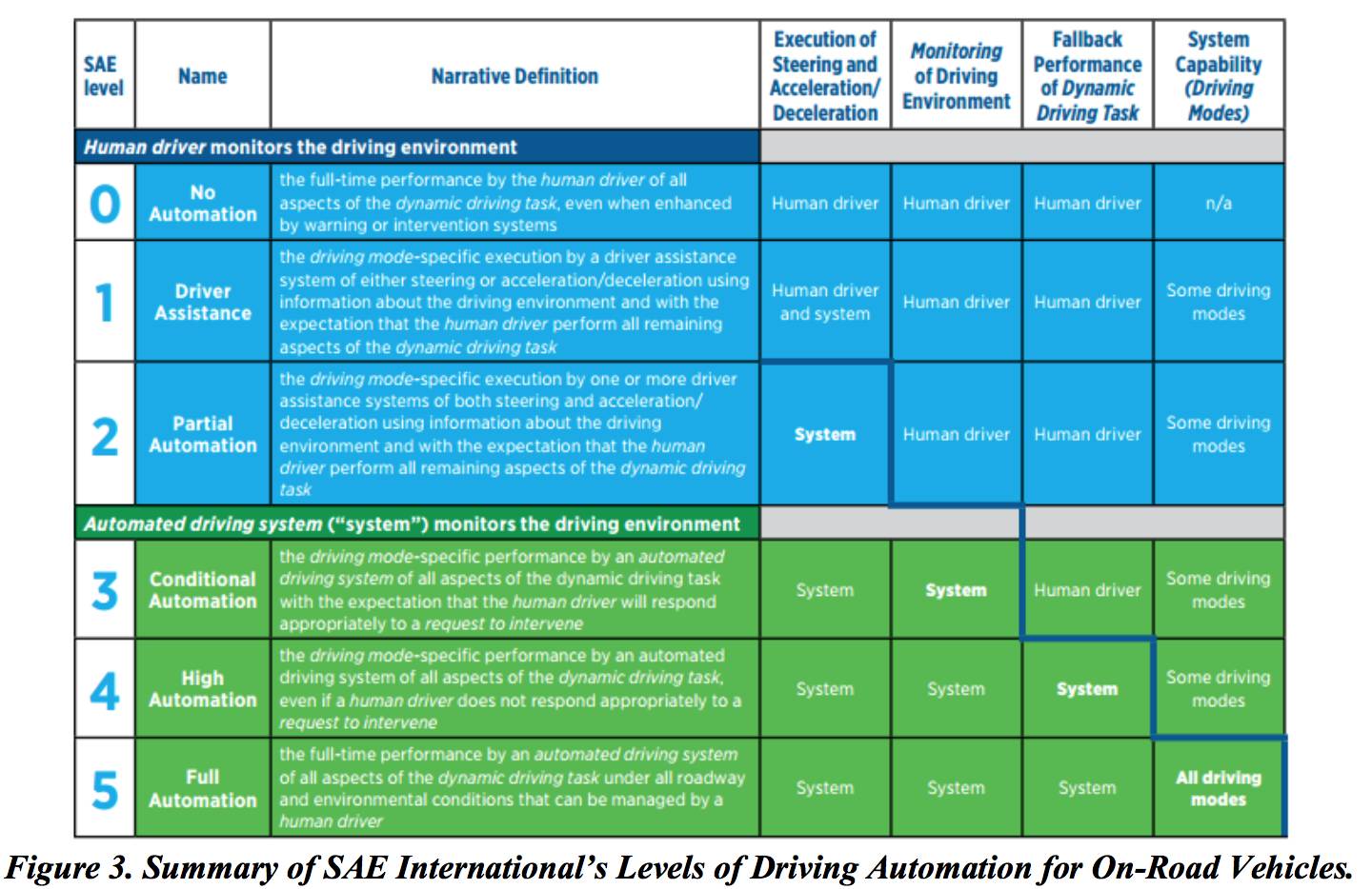 按照NHTSA分级,仅TACC使能的时候,特斯拉Autopilot系统属于一级自动系统,与Autosteer同时使用时升级为二级。图3是驾驶自动化分级总表,清楚地划分了每一个层次中驾驶员和系统之间的职能划分。一级二级系统需要驾驶员的持续关注,并在需要的时候随时接管。驾驶员牢记自己的责任,认清自动驾驶的局限性是保证安全的关键。