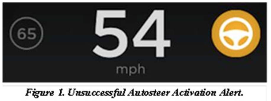 在尝试激活或意外接替自动转向(Autosteer)期间的意外系统响应可能使操作者不清楚车辆的状态(即“模式混乱”)。特斯拉的设计旨在防止模式混淆在几个级别,包括:1)在用户界面中提供有关自动驾驶仪的可用性、自动驾驶仪状态和状态之间成功和失败转换的信息;2)在自动转向或自动转向系统未成功激活的 40 秒内,当车辆越过车道线或道路边缘时,在方向盘上没有检测到驾驶员的手时,提供视听的“立即接管系统”(Take Over Immediately)警告;3)如果驾驶员在自动驾驶仪不可用时双向拉动巡航杆,尝试激活TACC和自动驾驶,则这两个功能都不会激活,自动驾驶指示器图标将闪烁橙色(图7),并发出声音警报。
