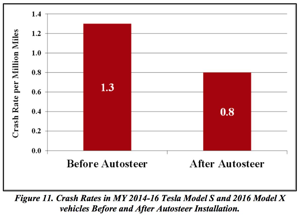 ODI 分析了特斯拉提供的 2014 年 5 月到 2016 年安装 Autopilot 系统的 Modle S 和 Modle X 车辆驾驶里程和保护气囊的数据,计算了安装 Autopilot 系统以前及之后按里程碰撞发生的几率。图 11 展示了 ODI 计算的在安装 Autopilot 系统以前及之后特斯拉汽车保护气囊使用的结果。数据显示,在安装 Autosteer 功能后,车辆碰撞几率降低了将近 40%。