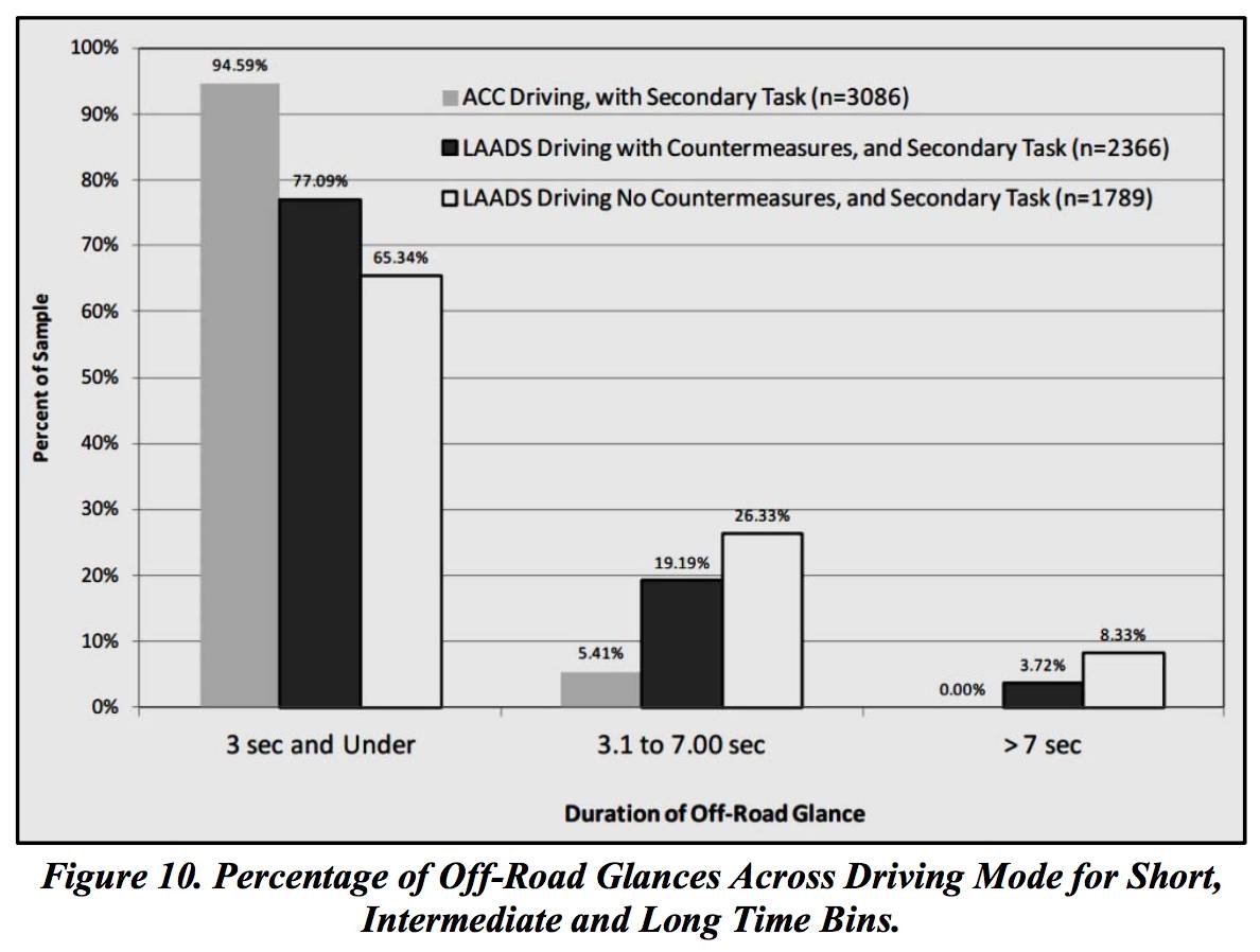 图 10 展示了在 GM 进行的一项实验中,驾驶员操作 LAADS 在 L1 和 L2 模式的 SAE 时,对道路环境注意力分布的情况。数据显示,在每种操作模式下驾驶员的注意力都会分散,并且在 ACC 模式或结合 ACC 模式与 Lane Centering Control 功能时,绝大多数注意力分散持续 3 秒或以下。ODI 分析发现,大多数碰撞都发生在不到 3 到 4 秒的时间。在佛罗里达致死事故中出现的超过 7 秒的注意力分散十分少见,但却是可以预计的。为了进一步调查其可预见性,有关机构对特斯拉下达了特别指令,让其评估特斯拉在设计系统时,对驾驶员操作失误(包括注意力分散)的考虑情况,以及该公司是否有在 Autopilot 设计中整合相关保护措施。特斯拉工程师的确考虑到了驾驶员操作失误的一系列可能性,也包括上述事故中发生的情况。ODI 还考察了驾驶员的操作失误是由于特斯拉设计缺陷所引起的的可能性,结果排除了相关可能。