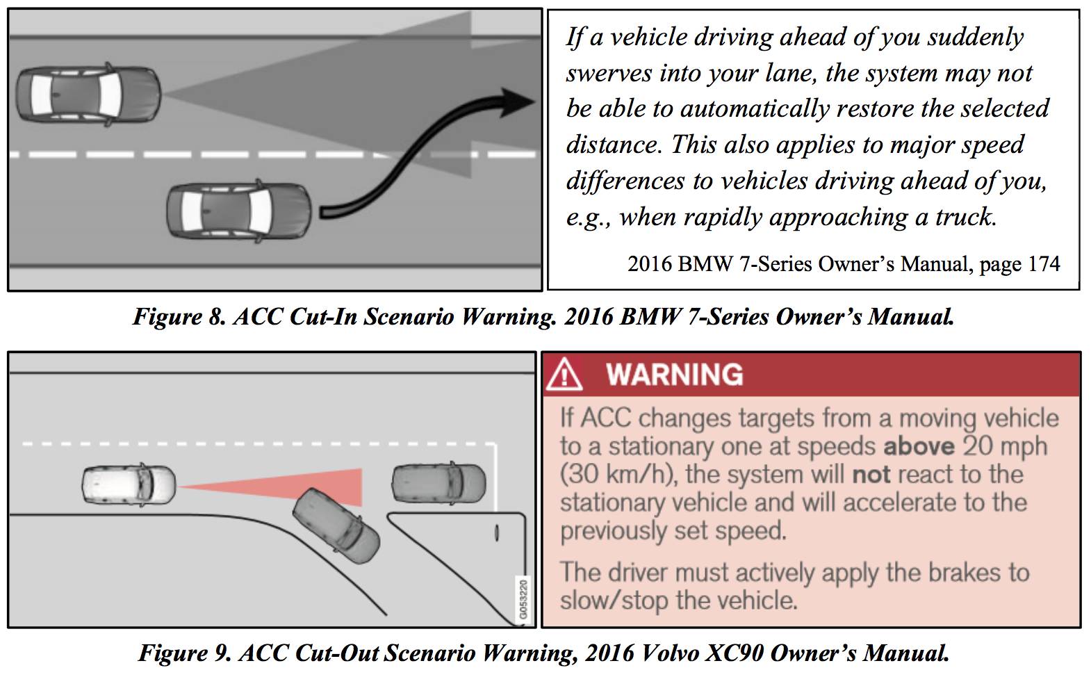 图8和图9展示了来自对等车辆所有者手册的警告的示例,其指示这些模式对于ACC系统在1级或2级操作模式中具有挑战性,并且可能需要驾驶员采取行动以避免碰撞。类似地,在讨论ACC时,BMW手册描述了系统限制,包括系统对交叉车辆不减速。
