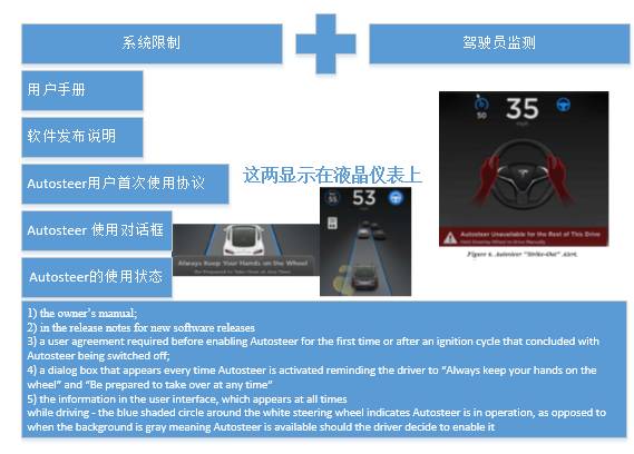 特斯拉以多个层次提供了系统局限性的信息,包括:1)用户手册;2)每次软件更新时候的更新说明,也指向用户手册;3)首次或一段时间后再次使用Autosteer之前,都有一个用户使用认可协议;4)每次Autosteer启动以后,仪表盘弹出对话框显示“请一直手扶方向盘”;5)用户界面呈现的信息,会在驾驶过程中一直显示,包括Autosteer的状态,亮白表示正在使用中,灰色代表现在是手动模式,但可以随时开启。