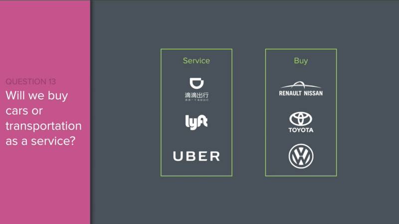 假如我们作为消费者,将从汽车制造商那里购买汽车的习惯转变为从 Uber、Lyft 这些公司购买出行服务,那么整个出行市场的方向将会发生完全的转变。