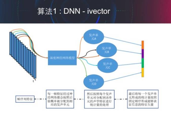 百度提供的资料显示,他们首先会用大量的数据训练一个能够将声学特征很好的对应到某一发声单元的神经网络,如下图所示。这样,每一帧特征通过神经网络后,就会被分配到某一发声单元上去。然后,会对每一句话在所有的发声单元进行逐个统计,按照每个发声单元统计得到相应的信息。这样,对于每一句话就会得到一个高维的特征矢量。