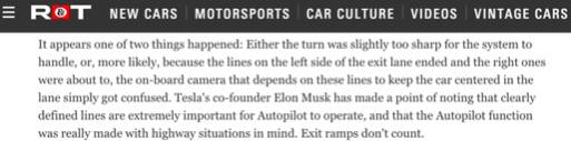 其实大部分L3搞不定缺乏车道线(non-marked)信息的匝道口,由于信息的不透明,广大读者也都不清楚,当然系统的辅助目的也不是为了搞定这个。特斯拉作为新锐企业,用户非常有品牌认可度,因此有大量的用户会乐于尝试AutoPilot,如果缺乏引导(用户往往不会有耐心阅读手册和提醒的),或者恰当的系统设计,是会导致AutoPilot滥用和误用的情况出现。