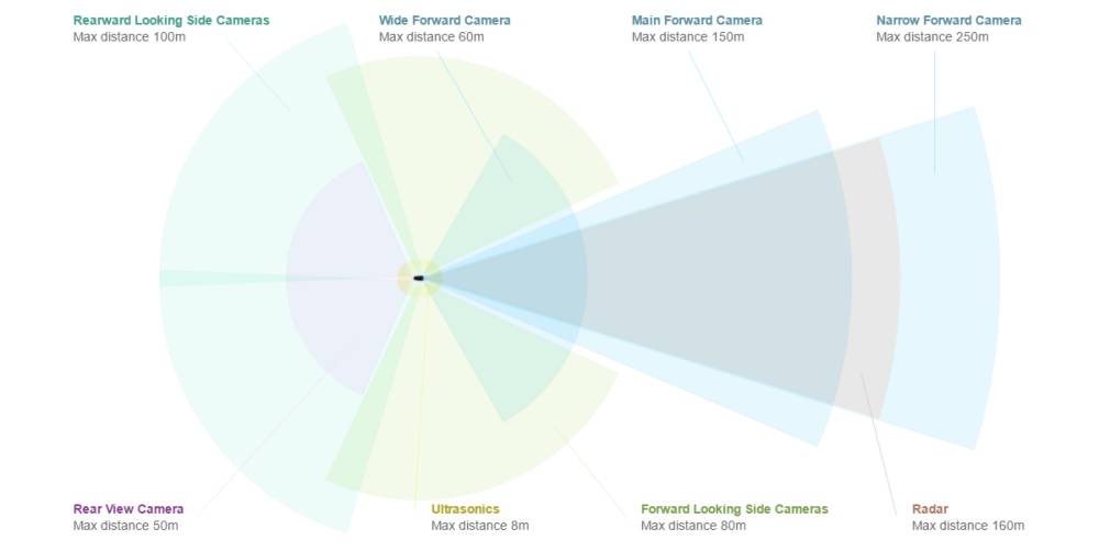 新的硬件套装仍然以超声波和前向毫米波雷达为主要传感器,但是,正如此前报道中提到的,全自动驾驶要求有360度的相机覆盖,这是新的传感器套件新增加的一个主要功能,