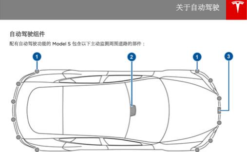 感知层是这次特斯拉事故的主要原因,在量产性价比和识别效果之间的权衡,让特斯拉选择了比较廉价的传感器组合,传感器配置图如下,图中1是安装在前后保险杠附近的超声波传感器,2是位与挡风玻璃上后视镜下方的Mobileye摄像头,3是安装在前格栅中部的77G毫米波雷达。