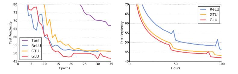 上图是WikiText-103(左)和 Google Billion Word (右) 的在不同激活机制模型下的学习曲线。可以看到,门线性单元(GLU,图中红线)在实现向更低的复杂性转换的过程是最快的。