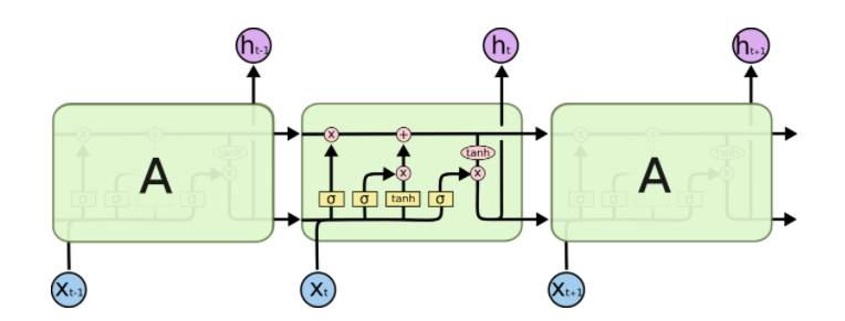 LSTM 模型的基本架构,其中中间四个相互交互的层,是整个模型的核心